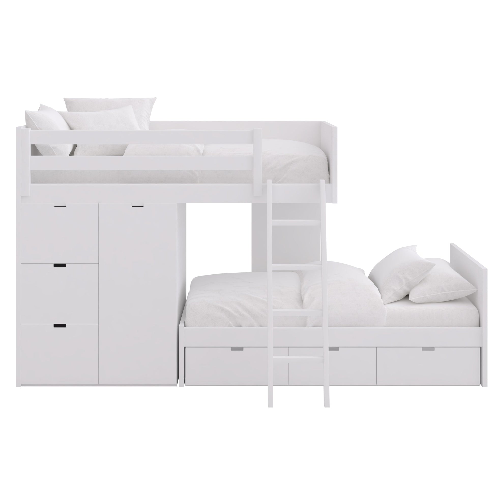 Equipada con 3 cajones con guías, 3 cajones contenedores y armario. Medida exterior del armario + cajones contenedores 97cm, medidas exteriores de la cama, ancho y largo 10 cm mas que el colchón, Altura total 161. Somier de laminas de madera de haya incluido.